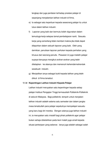 Membuka minda pelajar tentang alam pekerjaan. 4 14 Kepentingan Latihan Industri Kepada Pelajar Setiap pelajar yang mengikuti Pengajian di Politeknik Kementerian Pengajian Tinggi Malaysia telah diwajibkan untuk menjalani latihan industri selama satu semester bagi pelajar yang mengambil Diploma mereka akan menjalani latihan industri pada semester yang keenam. Up to 24 cash back Mendisiplinkan pelajar ke arah melahirkan pekerja yang berdisiplin setelah pelajar tamat pengajian di Politeknik.