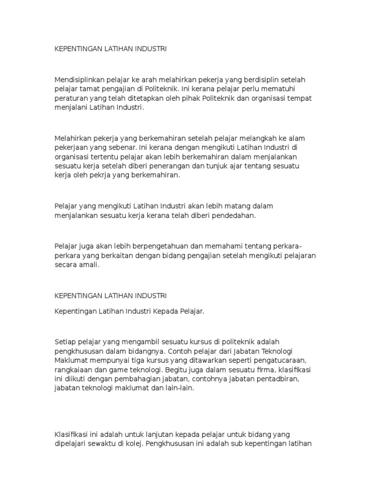 Menjalani latihan industri merupakan syarat wajib bagi setiap pelajar politeknik. Melahirkan pekerja yang berkemahiran setelah pelajar melangkah ke alam pekerjaan yang. Up to 24 cash back Kepentingan Latihan Industri Kepada Pelajar Setiap pelajar yang mengambil sesuatu kursus di politeknik adalah pengkhususan dalam bidangnya.